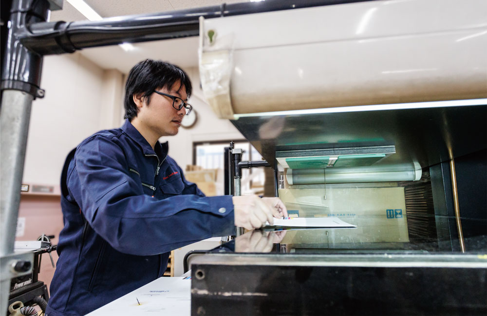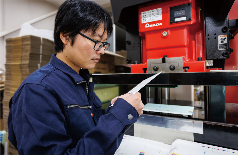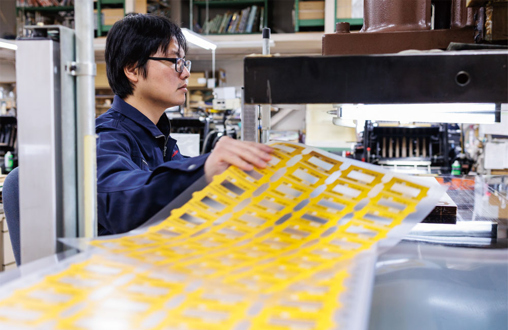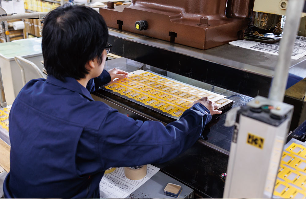 アップダウンプレス機によるトムソン加工では、AMADA TRL110(リンクモーションプレス)とAMADA SDE8018(デジタル電動サーボプレス)の2台を使い分けています。後者はプレススピードをデジタル設定出来るため製品に衝撃を与えて割れる等のトラブルを防ぐ事ができます。
