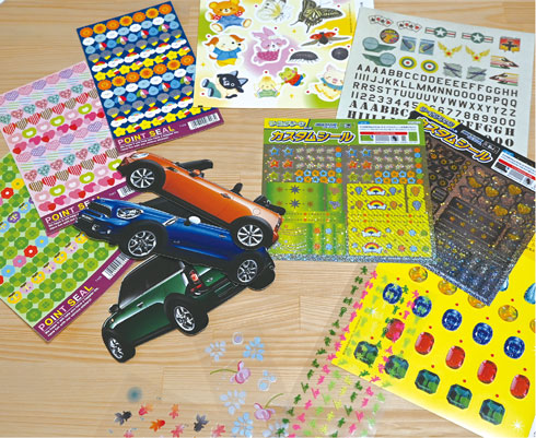 ファンシーシール、キャラクターシール、POPシール、スクラッチシール、目隠し・訂正シール、窓ガラスシール(両面シール)、工業用シール、JANシール、注意・警告ステッカー、フロアシール、砂絵シール、電車ステッカー、切り文字ステッカーなど