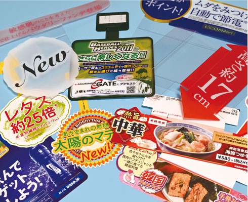 スイングPOP、ボトル(ネック)POP、ドアプレート、レールPOP、仕切りPOPなど