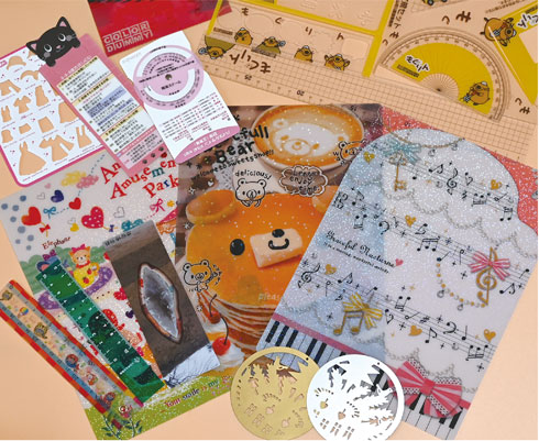クリアファイル、マウスパッド、インデックスファイル、ステンシルシート、下敷き、しおり、定規・物差しなど