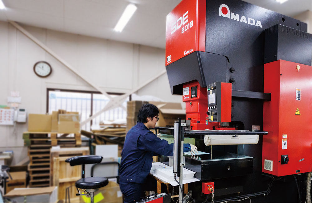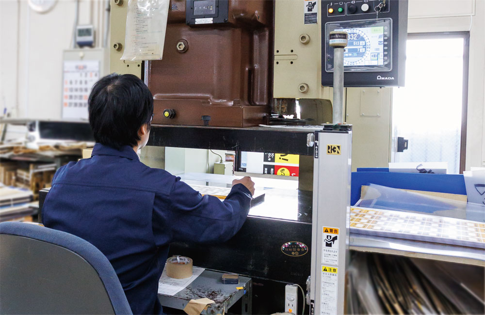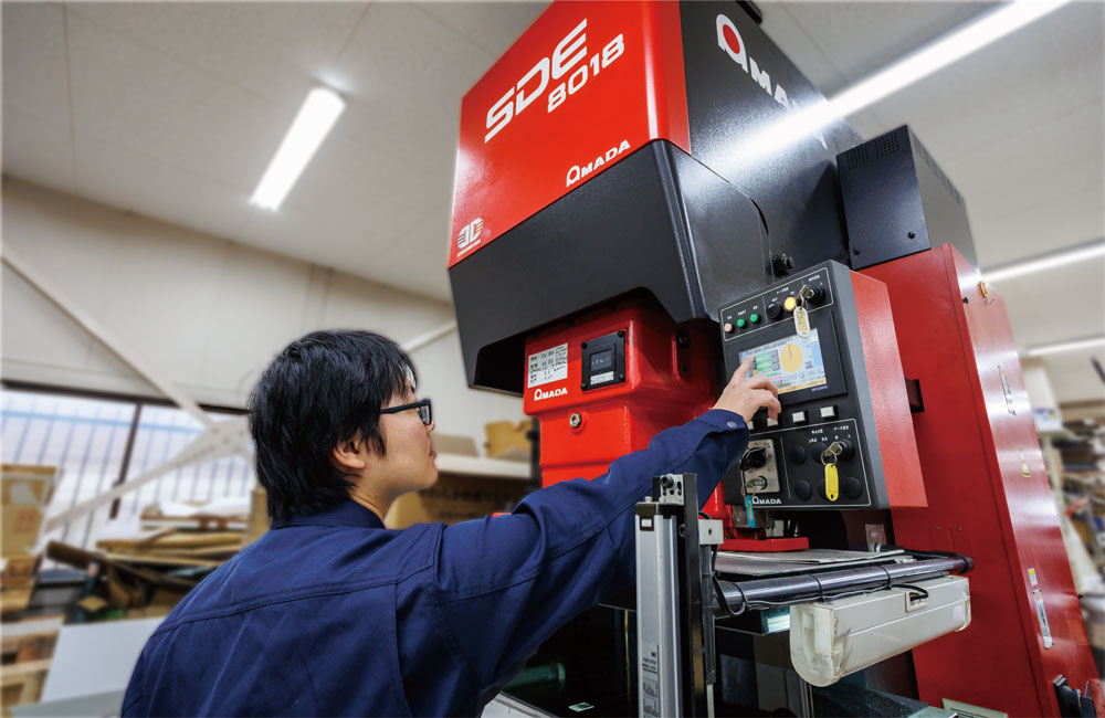 アップダウンプレス機によるトムソン加工では、AMADA TRL110(リンクモーションプレス)とAMADA SDE8018(デジタル電動サーボプレス)の2台を使い分けています。後者はプレススピードをデジタル設定出来るため製品に衝撃を与えて割れる等のトラブルを防ぐ事ができます。