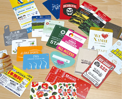 PETカード(ポイントカード、診察券等)、クリアカード(キャラクターカード等)、ダウンロードカード(可変コード・ナンバリング印字)、スタッフカードなど